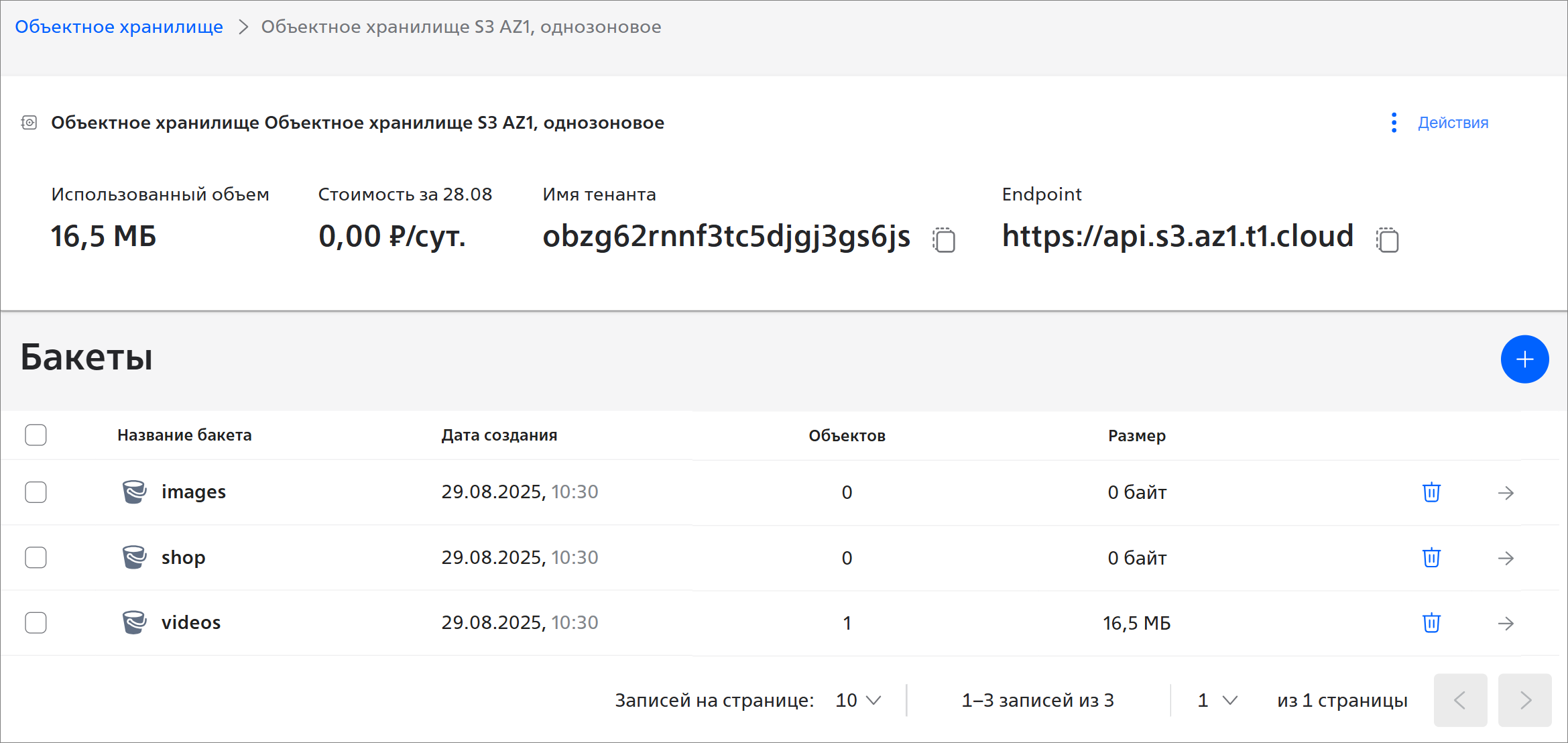 Чтобы просмотреть подробную информацию об Объектном хранилище S3, нажмите на строку с нужным хранилищем. Откроется страница с информацией о нём:
