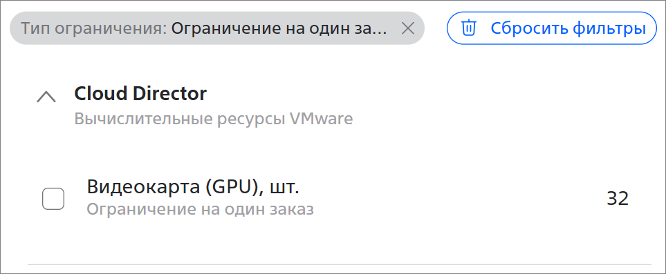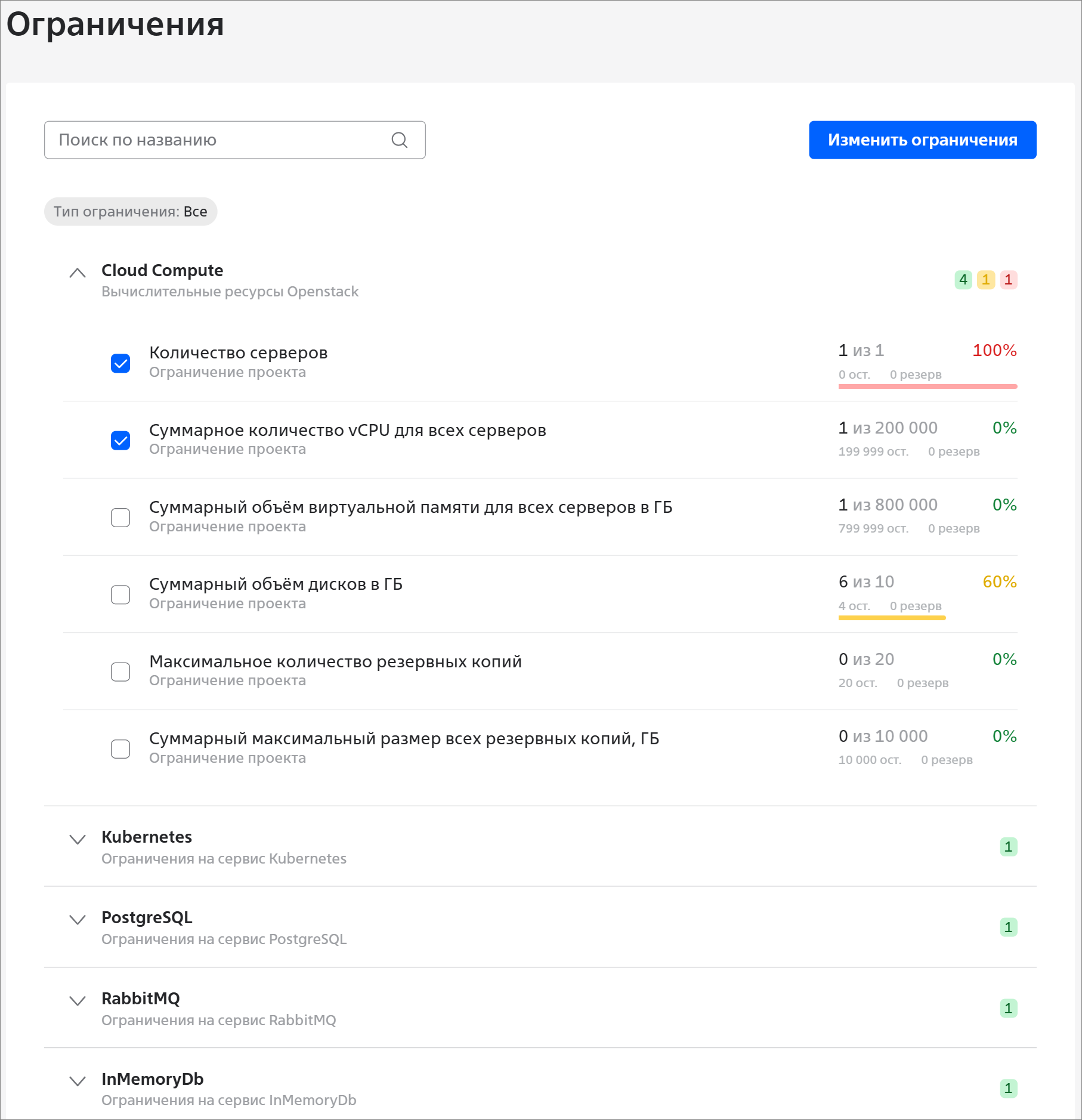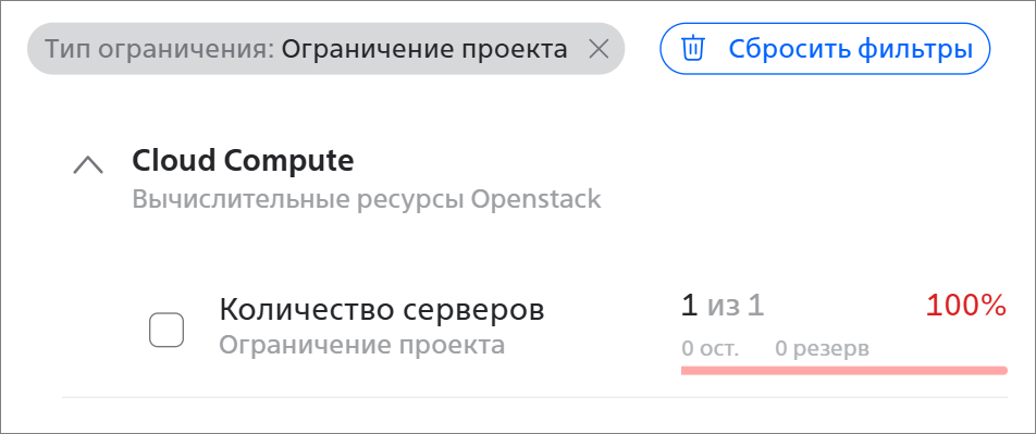 Отображается только ограничение на один заказ, количество заказанных ресурсов не отображается; - Ограничение проекта — действует в рамках одного проекта. Например, ограничение:означает, что в каждом проекте организации можно заказать максимум 1 сервер;