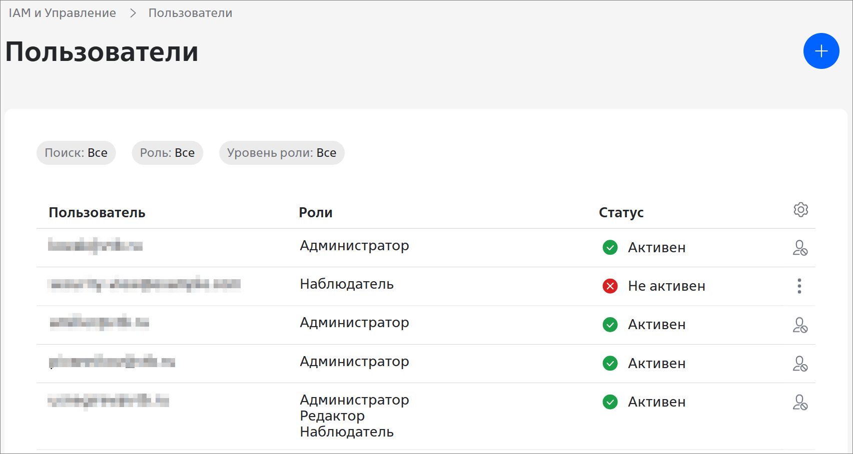 Чтобы создать нового пользователя или выдать права доступа существующему пользователю/сервисному аккаунту на организацию, папку или проект: