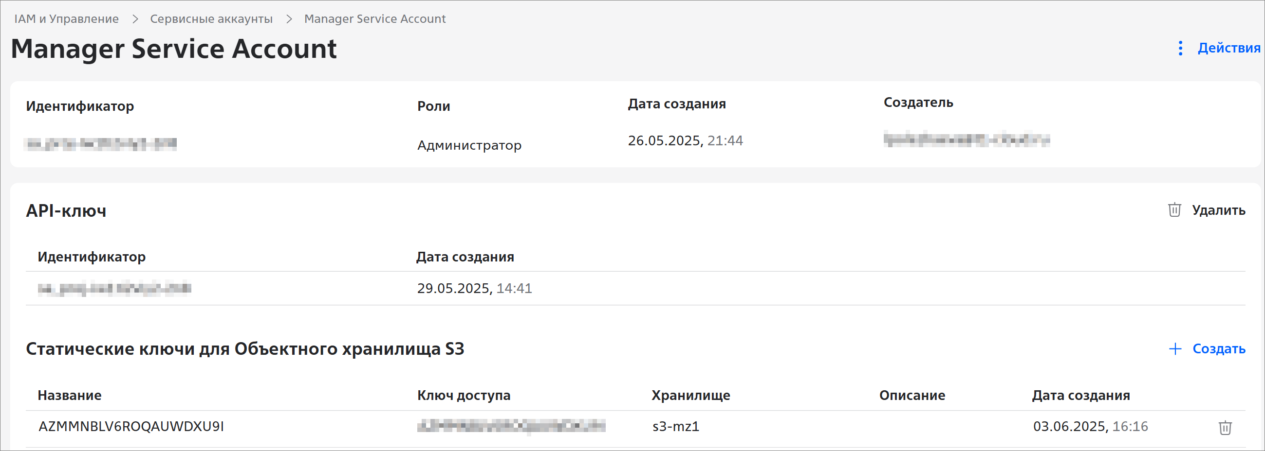 - в разделе Статические ключи для Объектного хранилища S3 отображаются ключи для доступа к Объектному хранилищу S3 через сторонние интерфейсы.