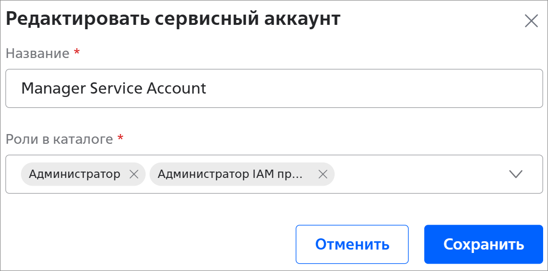 - Роли в каталоге * — роли сервисного аккаунта.