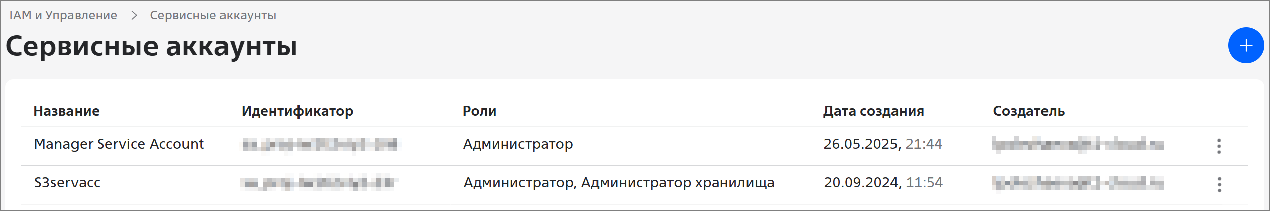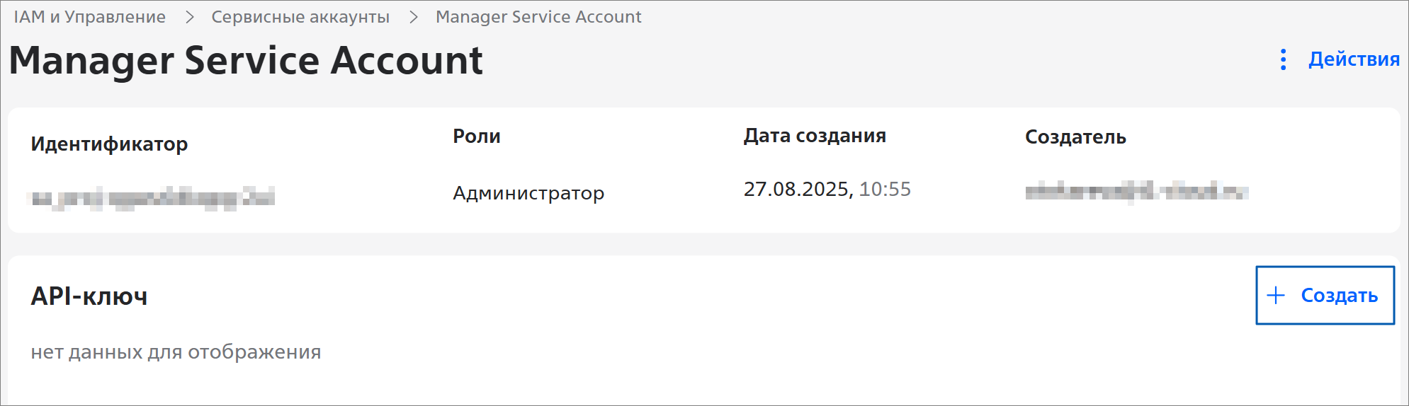 Чтобы посмотреть подробную информацию о сервисном аккаунте, нажмите на строку c нужным сервисным аккаунтом. Откроется страница с информацией о сервисном аккаунте: