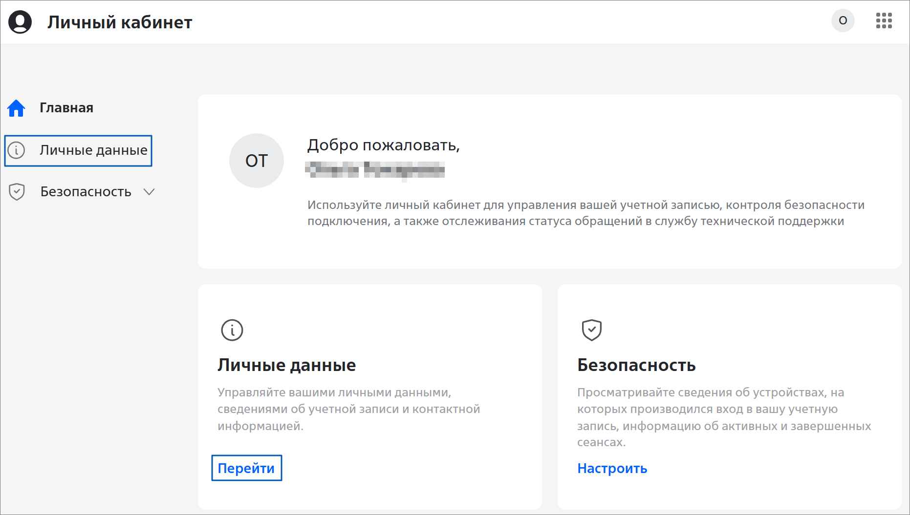 - Выберите пункт Личные данные или нажмите на кнопку Перейти в блоке Личные данные: