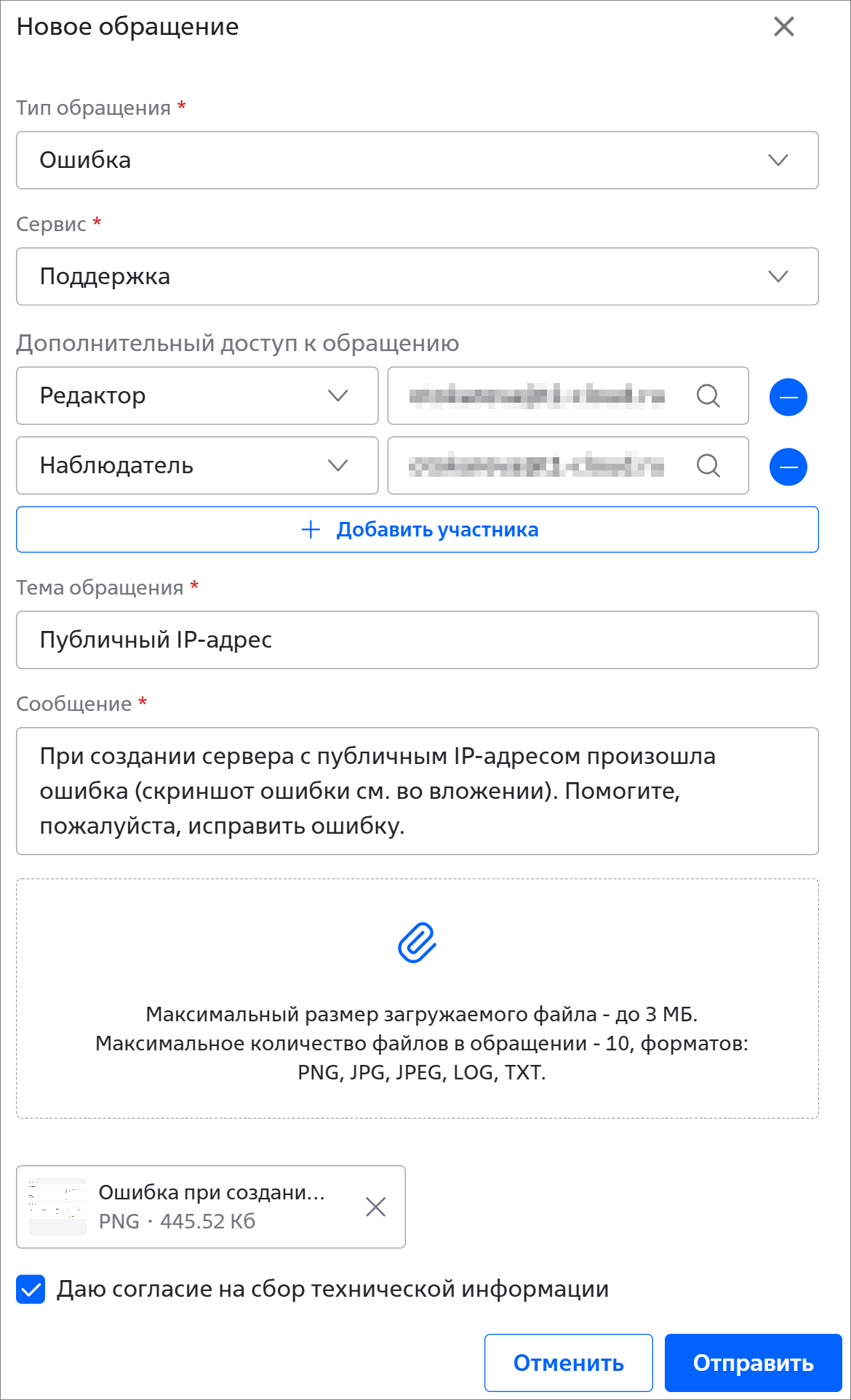 - установите флажок Даю согласие на сбор технической информации. Техническая информация — имя, email и логин пользователя, текущий контекст пользователя, а также ссылка на раздел портала, с которого пользователь перешёл к созданию обращения. Техническая информация необходима сотруднику тех. поддержки для обработки обращения.