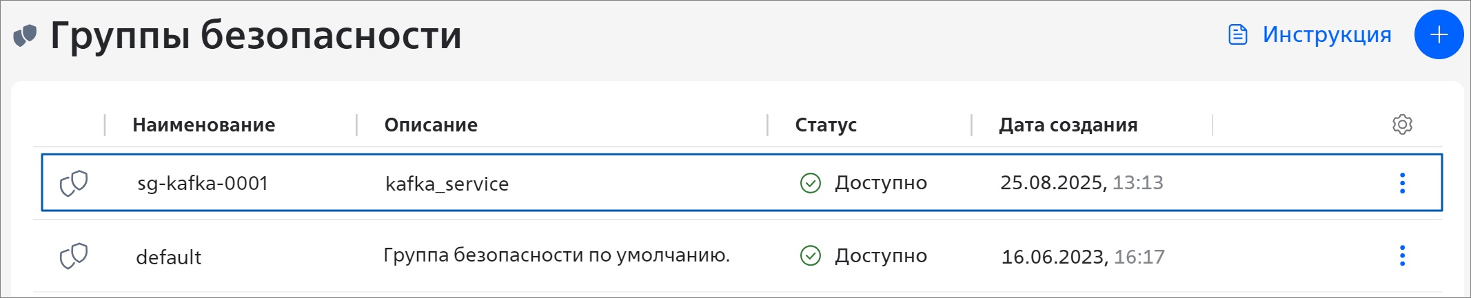 При первом создании кластера Kafka группа безопасности sg-<имя кластера> создаётся автоматически: