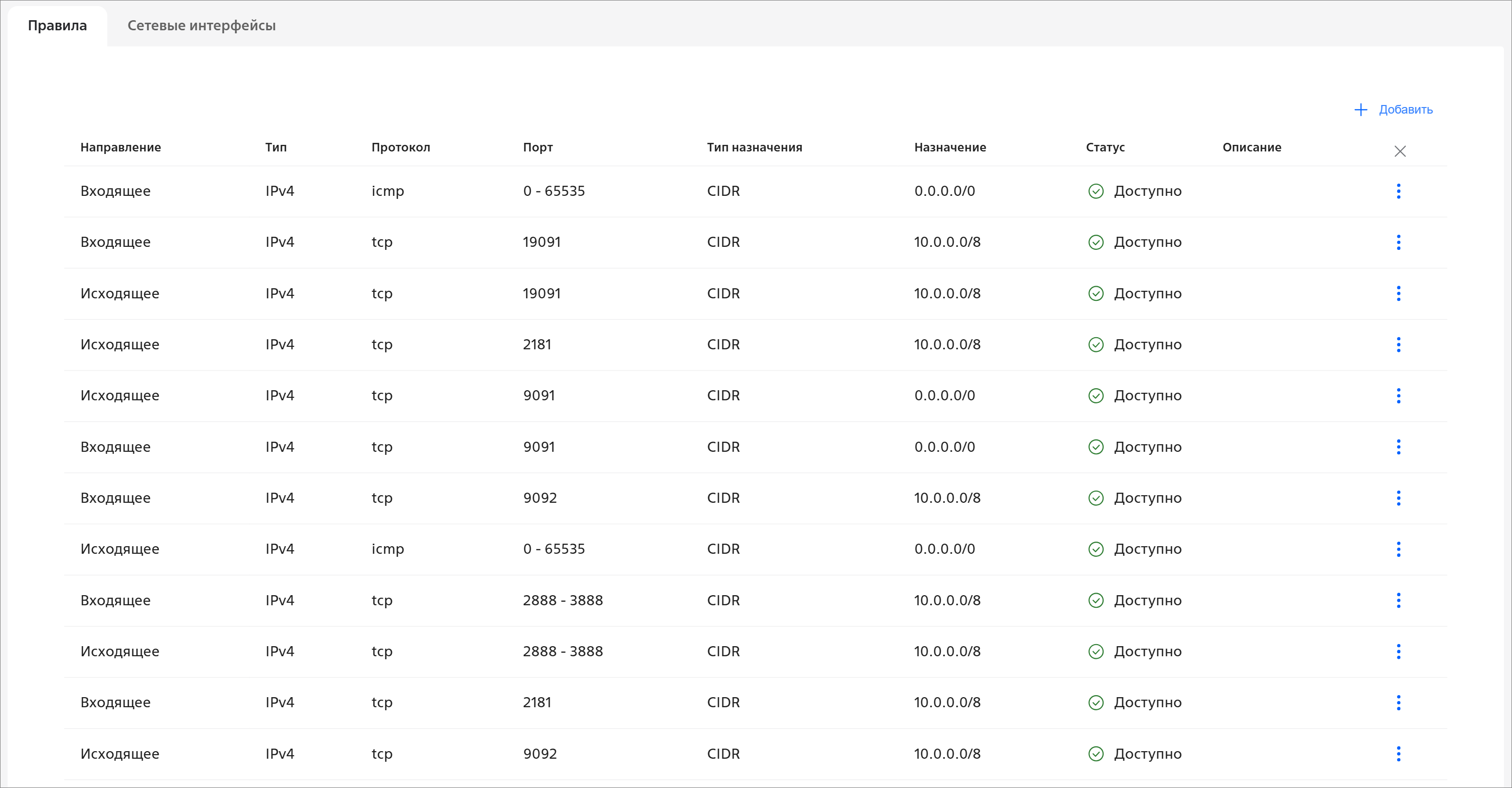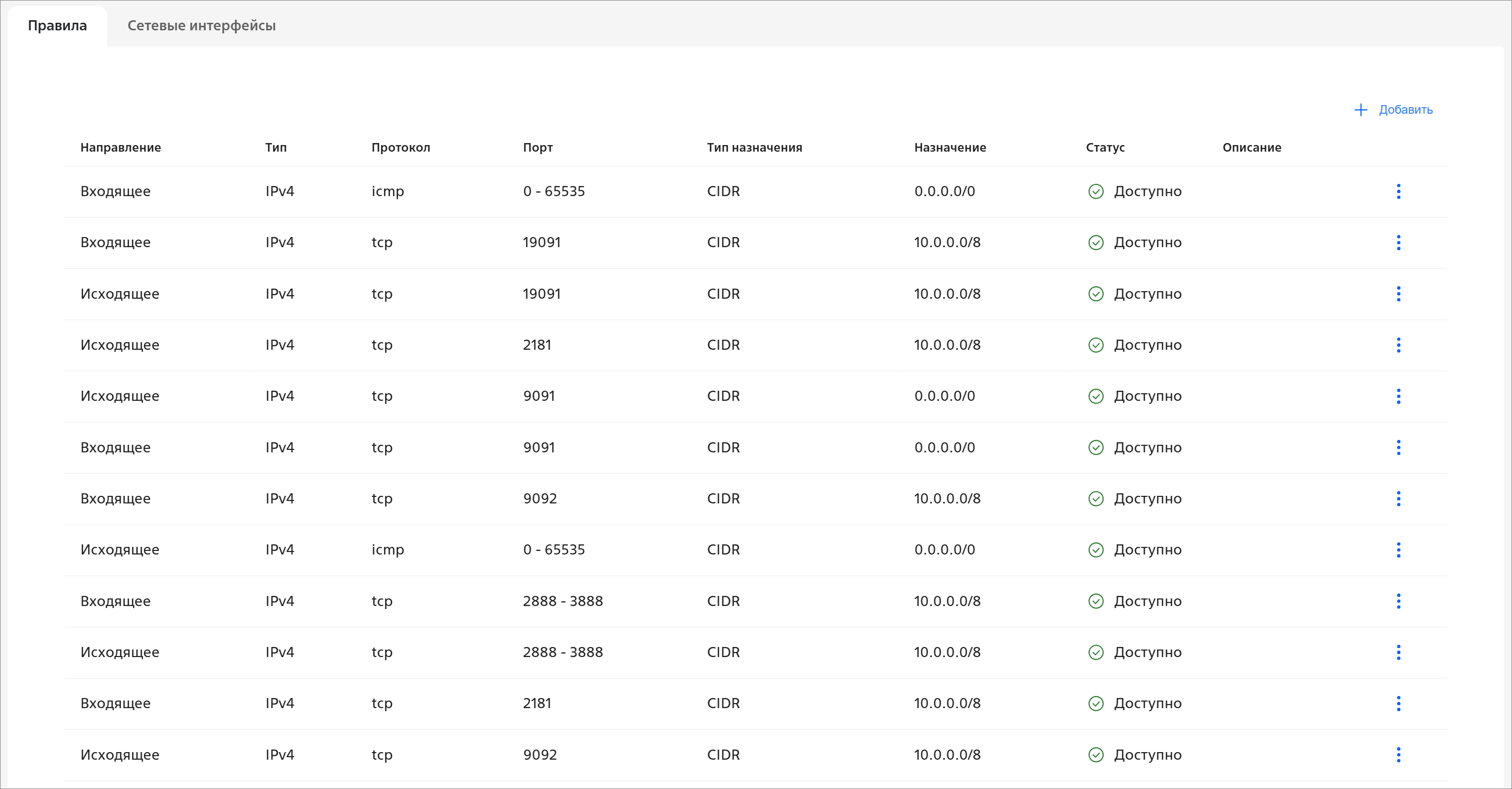 Группа безопасности для кластера Kafka содержит следующие правила: