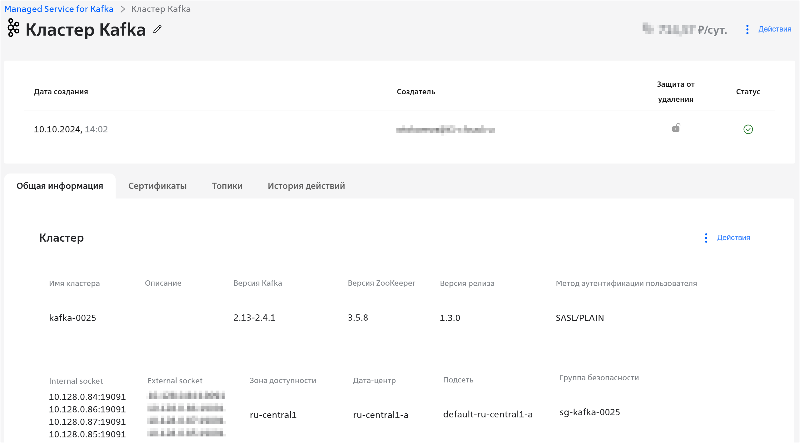 - Нажмите на строку с нужным кластером, откроется информация о кластере: