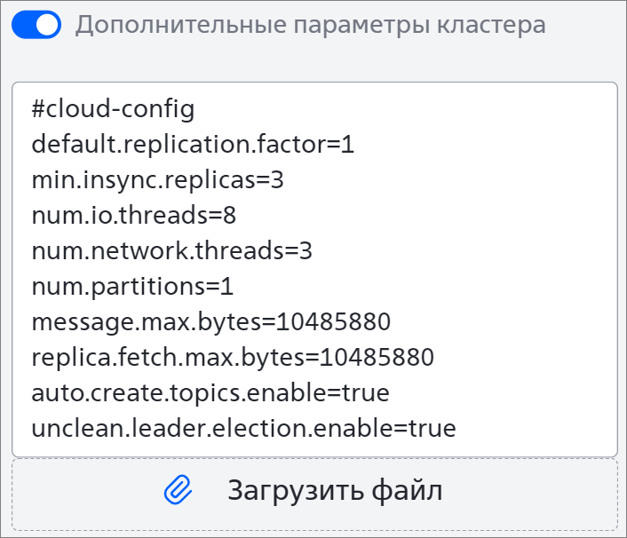 Если нужно задать дополнительные параметры кластера, активируйте переключатель Дополнительные параметры кластера. После первой строки #cloud-config напишите параметры со значениями или загрузите текстовый файл. Например: