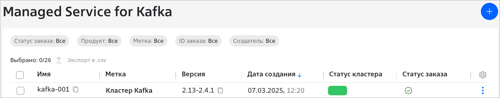 - В главном меню портала перейдите в раздел Ресурсы → Приложения → Managed Service for Kafka → Кластеры.