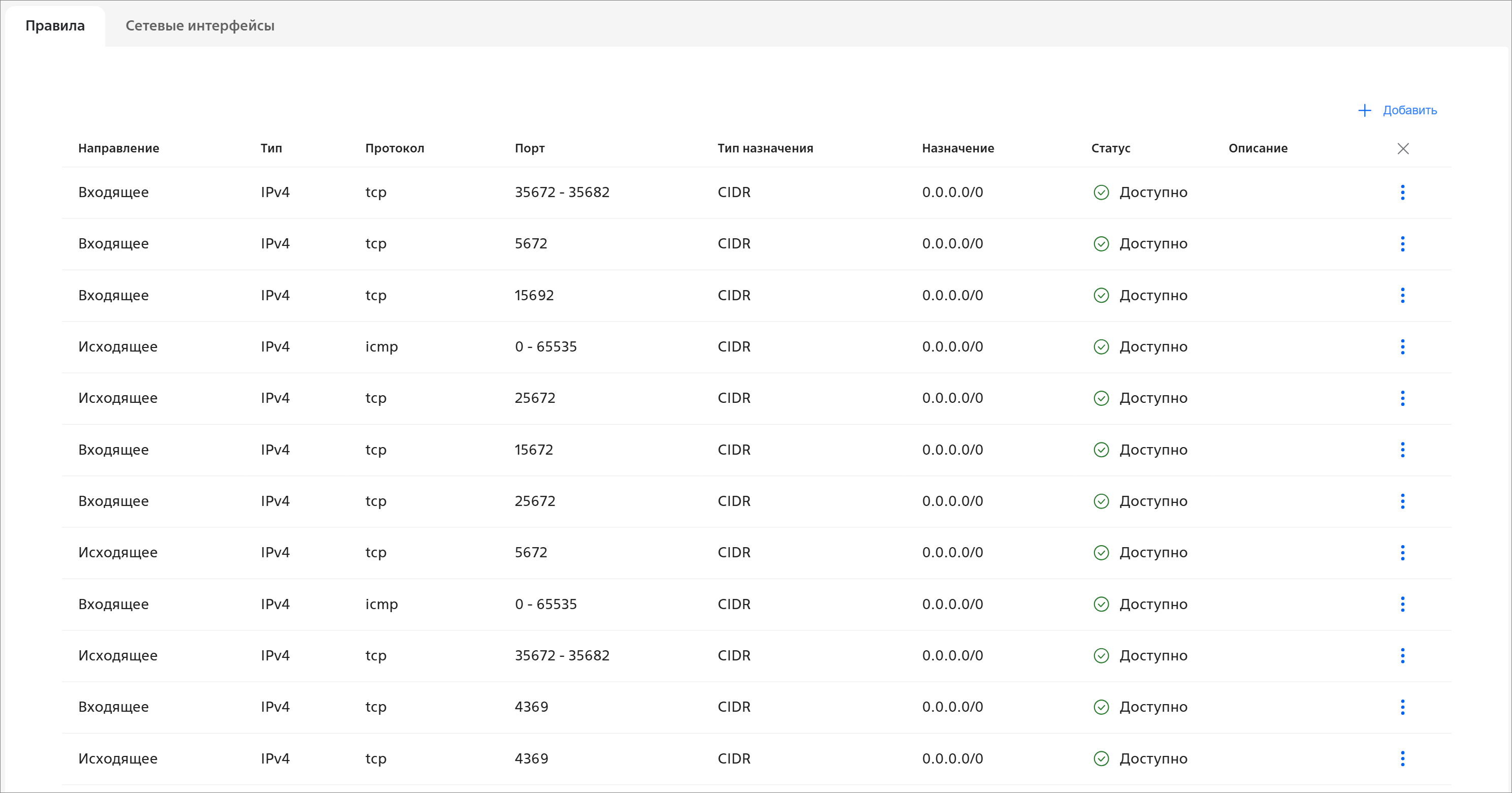 По умолчанию группа безопасности для RabbitMQ содержит следующие правила: