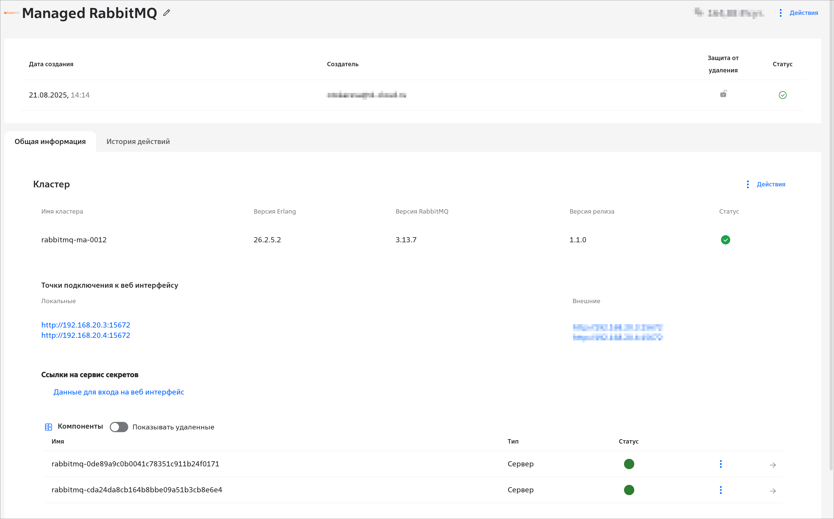 - на вкладке Общая информация отображаются основные параметры кластера, в том числе IP-адреса для подключения к RabbitMQ;