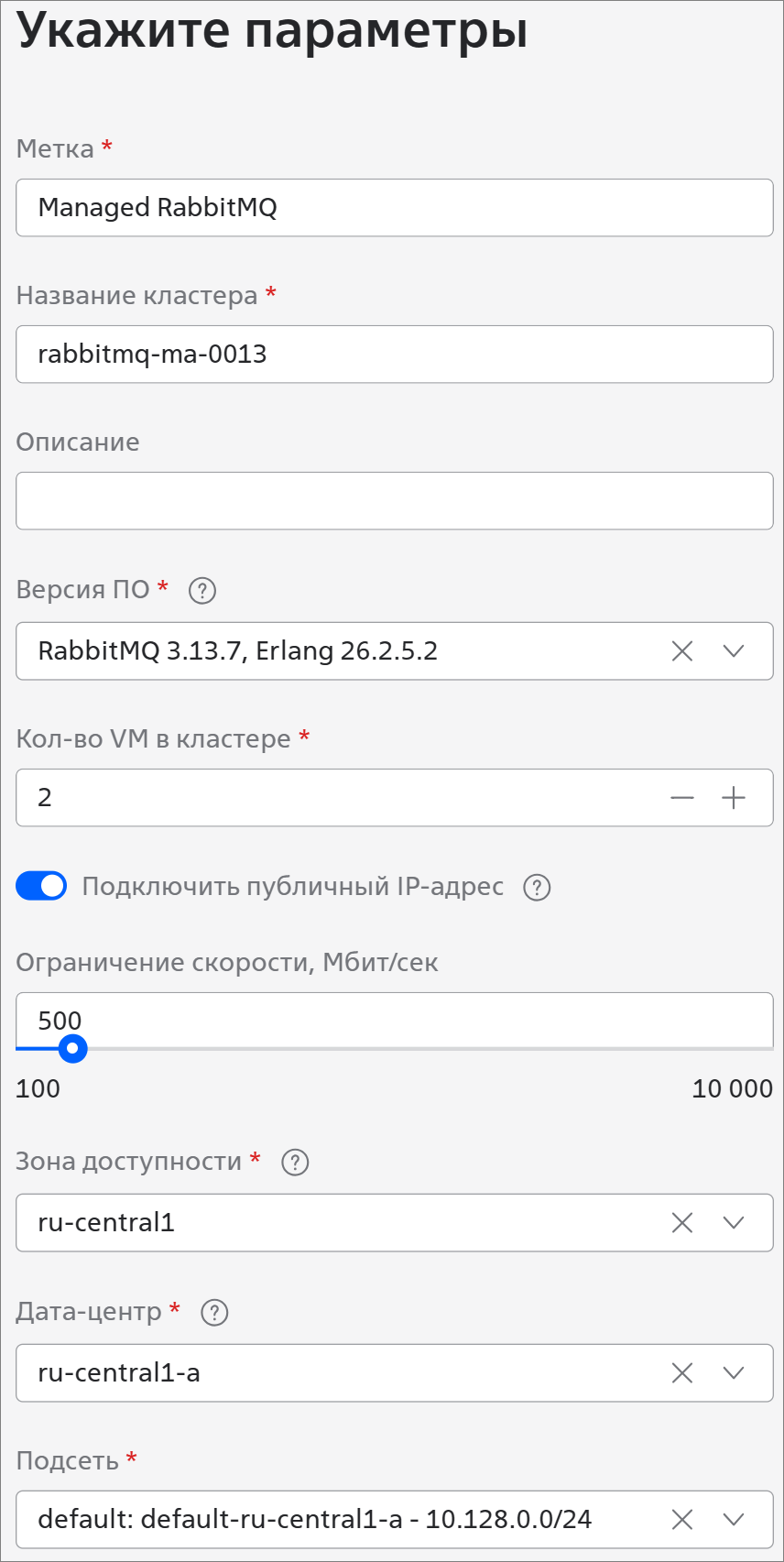 Название кластера * — уникальное название кластера в рамках проекта. Значение по умолчанию — rabbitmq-ma-<номер>, например, rabbitmq-ma-0001. Последующим кластерам будут присваиваться имена с увеличивающимся порядковым номером.