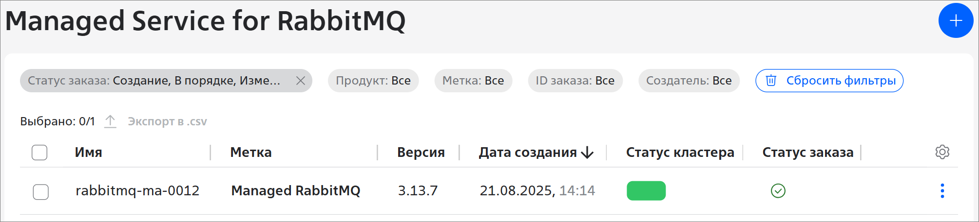 - В главном меню портала перейдите в раздел Ресурсы → Приложения → Managed Service for RabbitMQ → Кластеры.