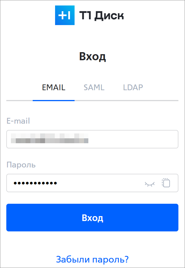 Если вы забыли пароль от учётной записи Т1 Диск, восстановите его по ссылке Забыли пароль?.