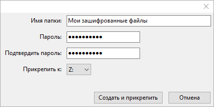 - Прикрепить к — локальный диск, в котором будет располагаться папка с зашифрованными файлами.
