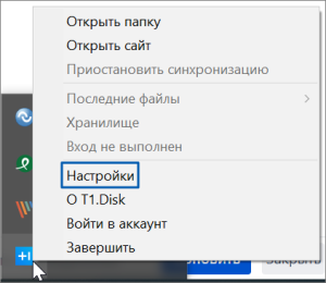 - На панели быстрого доступа ОС в контекстном меню приложения Т1 Диск выберите пункт Настройки: