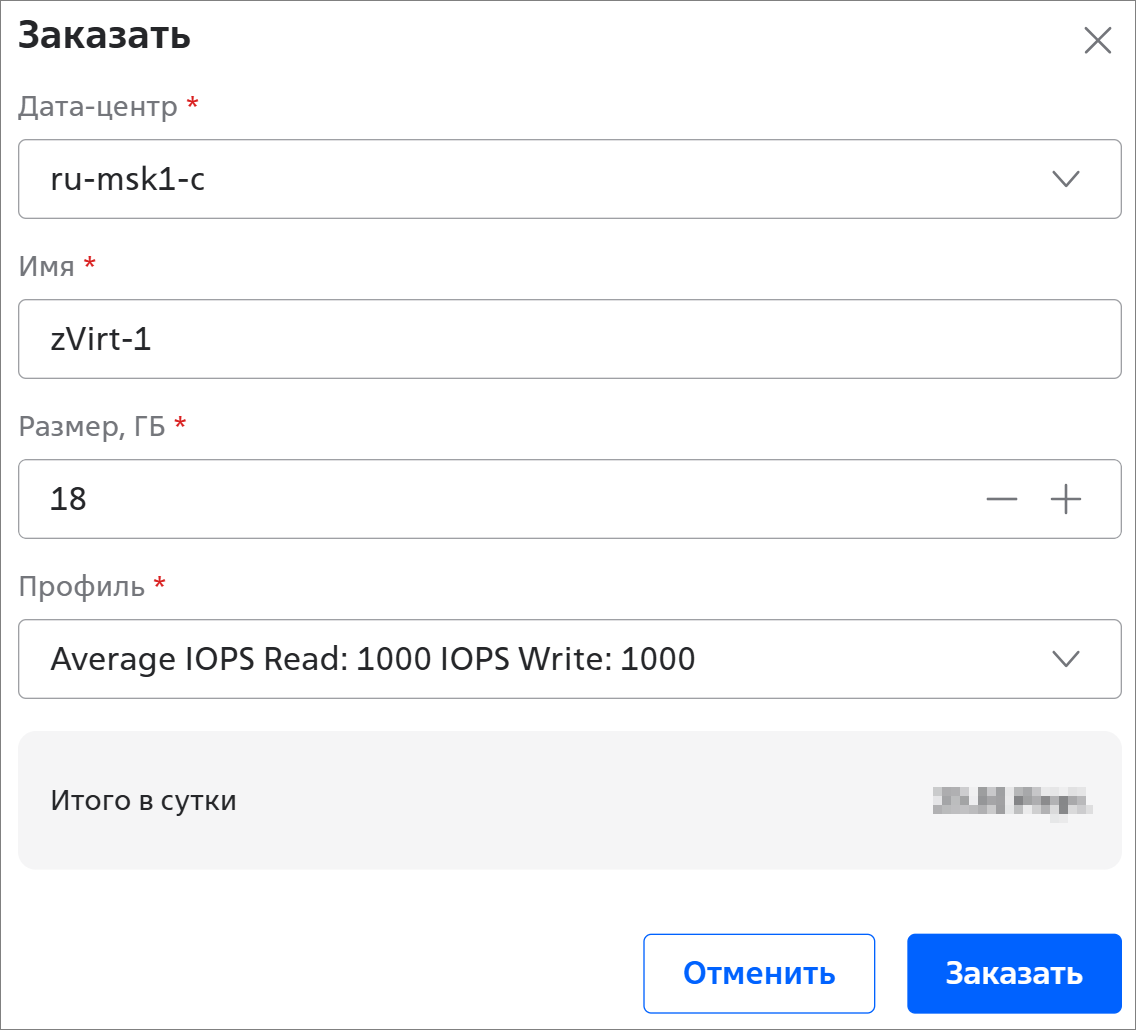 - Дата-центр * — ЦОД, в котором будет находиться диск;